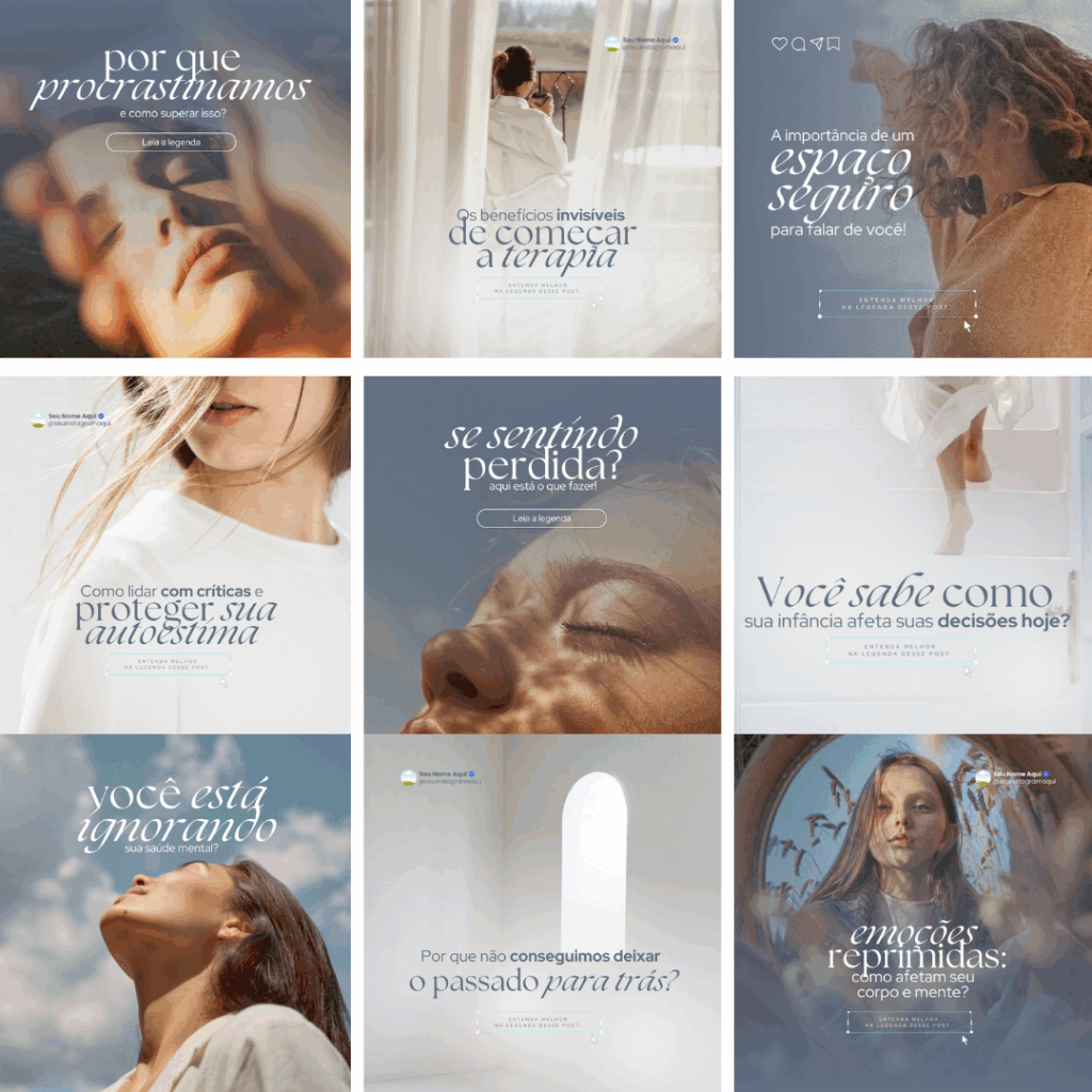 🧘♀️ Feito para terapeutas que desejam transmitir acolhimento, profissionalismo e autoridade nas redes. Ideal para quem quer atrair o público certo com uma comunicação visual estratégica, humana e cheia de propósito.